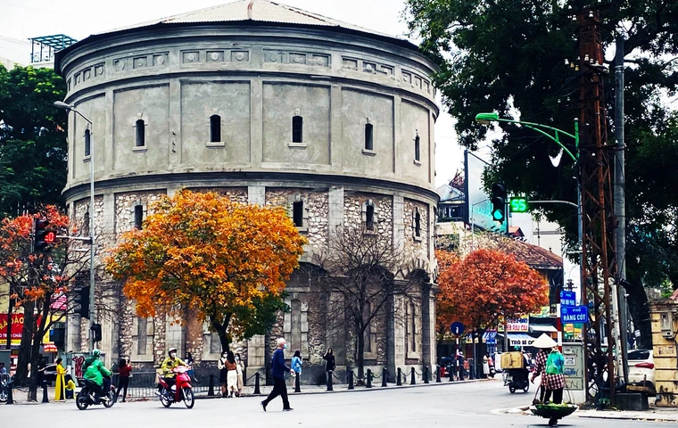 Hàng cây lộc vừng trổ lá non đỏ rực tô thêm vẻ cổ kính của Bốt nước Hàng Đậu trong những ngày tháng Ba. Ảnh: Trần Hưng