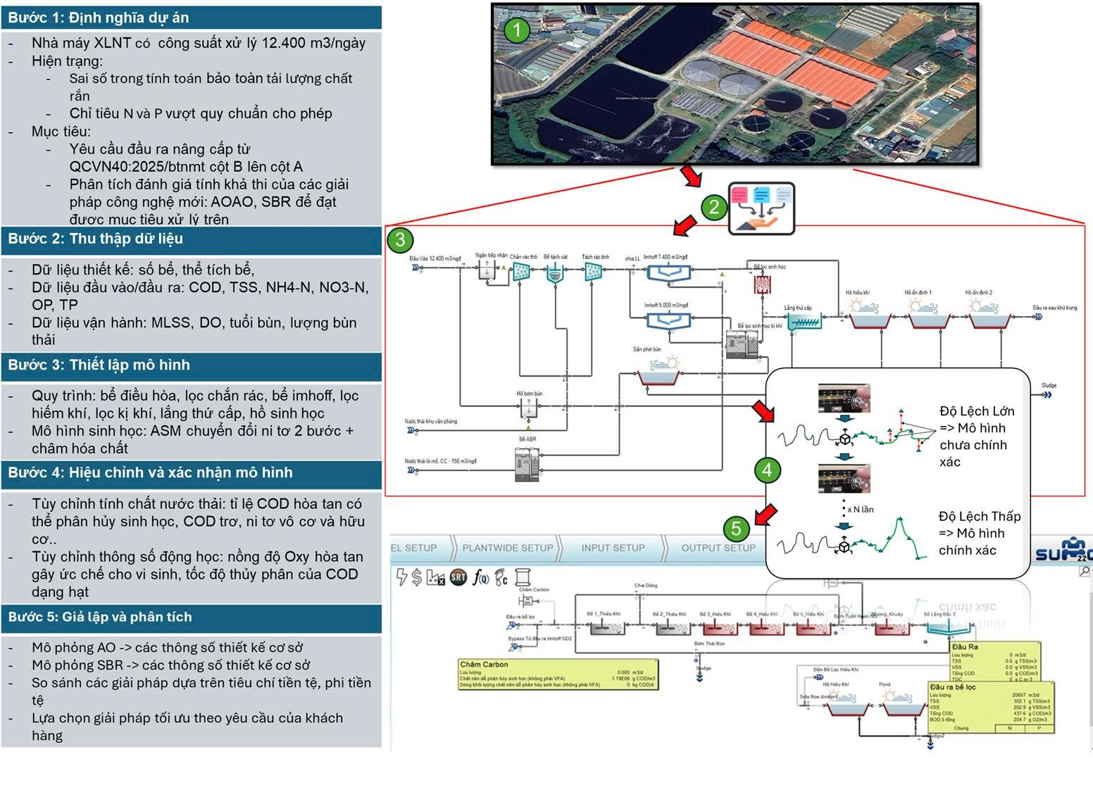 Hình 4 thể hiện quy trình xây dựng MHH hiện trạng cho một nhà máy XLNT có công suất thiết kế 12.400 m3/ngđ, nồng độ COD = 800 mg/L, BOD5 = 400 mg/L, N-NH4+ = 80 mg/L, TN= 120 mg/L, TP = 25 mg/L, sử dụng bể lọc sinh học nhỏ giọt và bể lọc sinh học kị khí, nước thải đầu ra vượt quy chuẩn QCVN 40:2025/BTNMT, cột B ; đồng thời giả lập và phân tích 02 kịch bản cải thiện chất lượng nước sau xử lý, sử dụng công nghệ bùn hoạt tính cải tiến, hệ thiếu khí-hiếu khí (Anoxic-Oxic) và hệ phản ứng theo mẻ (Sequencing Batch Reactors, SBR), đảm bảo nước thải đầu ra đạt quy chuẩn theo QCVN40:2025/BTNMT, cột A [8] bằng phần mềm SUMO ; với các thông số chất lượng nước đầu ra như sau : Với phương án AO : COD = 27 mg/L, BOD5 = 2.8 mg/L, TN = 15.2 mg/L, N-NH4+ = 0.2 mg/L, TP = 2.5 mg/L ; với phương án SBR : COD = 50 mg/L, BOD5 = 11 mg/L, TN = 11 mg/L, N-NH4+ = 0.2 mg/L, TP = 1.1 mg/L.